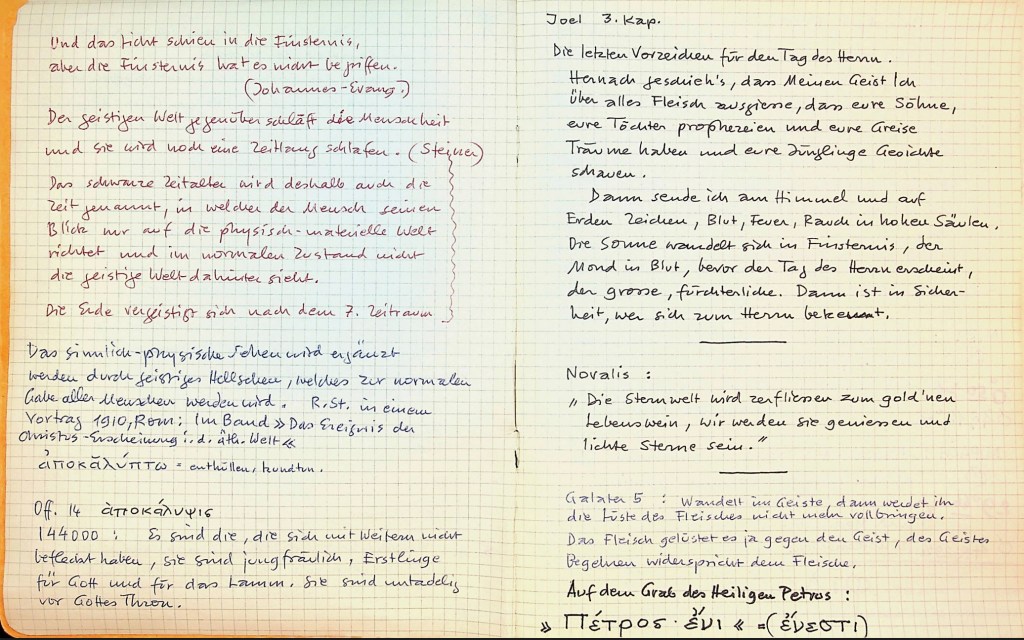 R. St. »Die Apokalypse des Johannes«: „All die Seelen, die den Anschluss finden mit dem Christus-Prinzip steigen den Weg nach oben. Alle Seelen aber, die treu zusammen- halten zum niedrigen Ich, zur Selbstsucht und nach in den Abgrund hinuntertreiben. So wird das Ich, der Egoismus allmählich ausgelöscht und uninteressant sein, mit diesem die niedere Lustbefriedigung und die irdische Welt.“