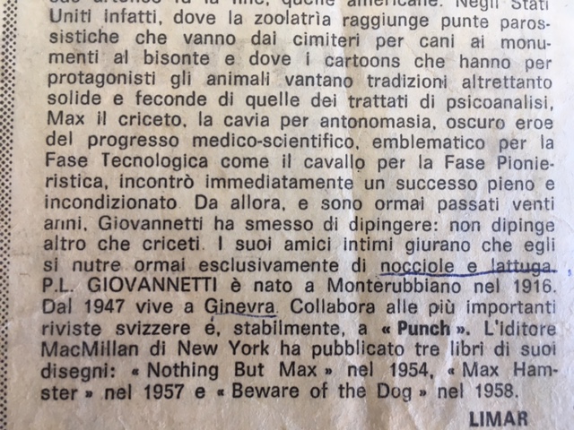 “Pericle Luigi Giovannetti was a Swiss artist and painter. He was born in Basel and spent most of his secluded life in Ascona. He is best-known for his cartoons, picture stories and anthropomorphic birds, that were published in magazines and anthologies. His biggest success was the marmot ‘Max’, who made his first appearance in the satirical British magazine Punch in 1952. Few people were aware of Giovannetti’s painting skills, since he never exhibited or sold his works.”